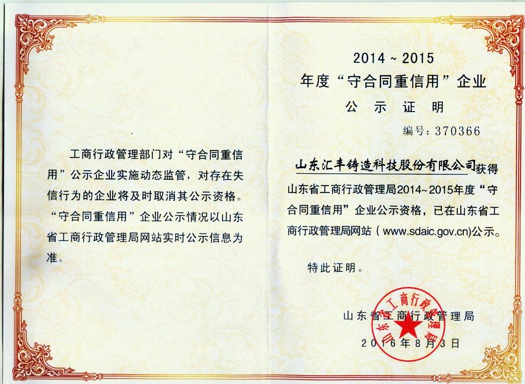 2016年8月,山东汇丰铸造科技股份有限公司被山东省工商局评为“守合同重信用”企业。这是山东汇丰铸造科技股份有限公司在加强企业守信经营、提升企业品牌影响力的又一次展示。对于公司来说,这个荣誉不仅象征着自身形象和信誉,同时对公司提升质量和品质有巨大的激励作用,可有效提高企业的市场竞争力,促进企业健康稳步发展。