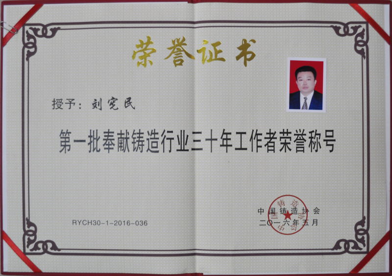人生的价值在于奉献。为了企业的发展,董事长刘宪民殚精竭虑,如凤凰涅磐,如春蚕烛炬奉献出了自己的青春岁月。事业的成功在于拼搏,“三顾频烦天下计,两朝开济老臣心”,凭借自己坚实的信念,坚强的毅力,他用汗水和青春换来了企业的成功,使企业的发展得到了社会的关注和认可。在今年六月这个大喜的日子,董事长刘宪民再次得到中国铸造协会的肯定,荣获“第一批奉献铸造行业三十年工作者荣誉称号”。